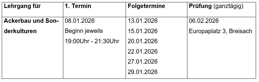 Das Landratsamt Breisgau-Hochschwarzwald, Außenstelle Breisach, bietet ab Januar 2026 einen Basislehrgang „Sachkundenachweis Pflanzenschutz“ für Anwender an. Der Lehrgang wird per WEBEX (Onlineschulung) angeboten, umfasst 7 Unterrichtstermine (abends) und schließt mit einer Prüfung (Prüfungstag) ab. Die Prüfung findet als Präsenzveranstaltung im Landratsamt, Fachbereich Landwirtschaft, Europaplatz 3 in Breisach statt.